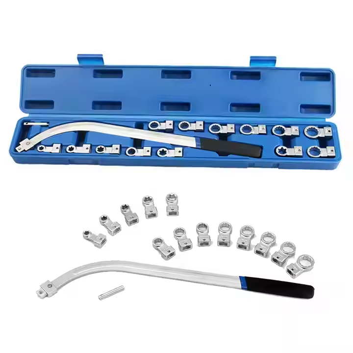 Το σετ αποτελείται από ένα κλειδί εντατήρα ζώνης και εναλλάξιμες κεφαλές από ανοξείδωτο ατσάλι, για την επισκευή και την τάνυση των ιμάντων του κινητήρα. Κατάλληλο και για επαγγελματική χρήση με αυτόματη στερέωση κεφαλών και κλειδαριά ασφαλείας.
